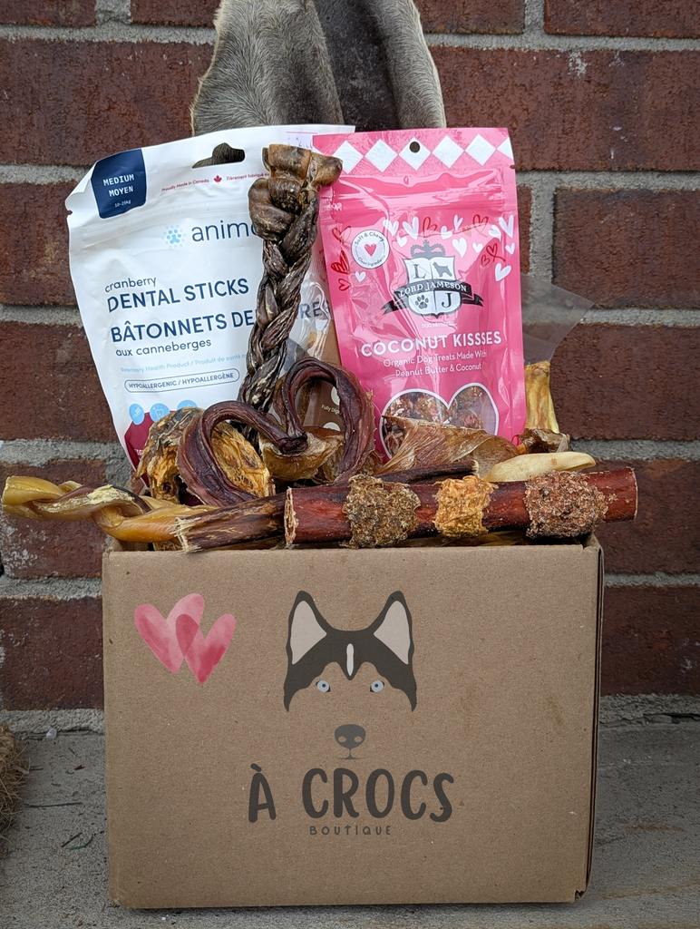 Profitez de 20% de rabais sur notre boîte de St-Valentin. Une boîte remplie de gâteries, de mastication et d'amour 💞